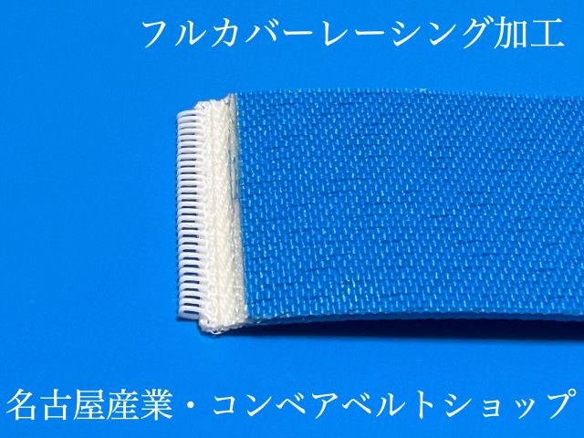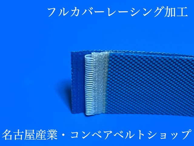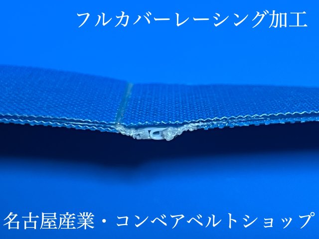 フルカバータイプとは写真2枚目の様に、繋ぎ合わせた樹脂レーシング部分をベルト表面のカバー材を被せることでレーシング全体がベルトにより覆われ、樹脂レーシングに掛かる負荷や搬送製品への傷防止対策にも役立ちます。
