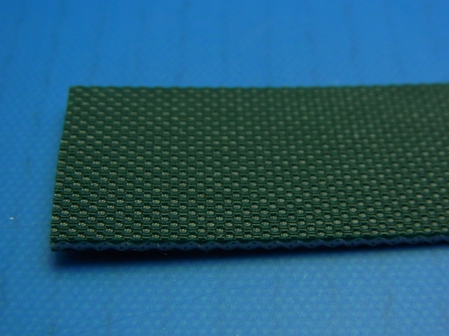 表面ウレタン、平滑艶ありダークグリーン色、裏面ウレタン、布目模様、ダークグリーン色の両面カバータイプ、バンドー製品ベルトとなります。