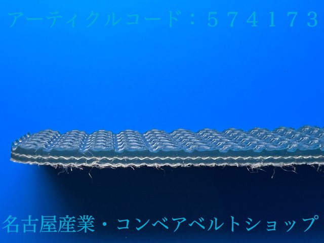表面藍色の凹凸(ラフトップ)ベルトとなります。一般的に使用されているラフトップベルトと比べ、ベルト厚みが薄く・シボ付ベルトに近い2プライベルトとなります。ベルト表面の凹凸形状によって段ボール搬送・箱物搬送など、グリップを必要とする搬送工程にて使用いただけます。